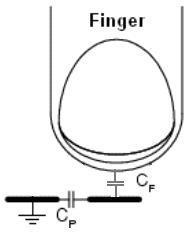 要感應(yīng)到手指的存在,電容式感應(yīng)系統(tǒng)首先要知道沒有手指時(shí)的傳感器電容(見圖2a),也稱為寄生電容(Cp)。當(dāng)手指接近或接觸傳感器時(shí)(見圖2b),傳感器電容值將會變化,這就產(chǎn)生了和Cp并聯(lián)的另一個(gè)電容,稱為手指電容(Cf)。有手指存在時(shí),總傳感器電容(Cx)如方程1所示: