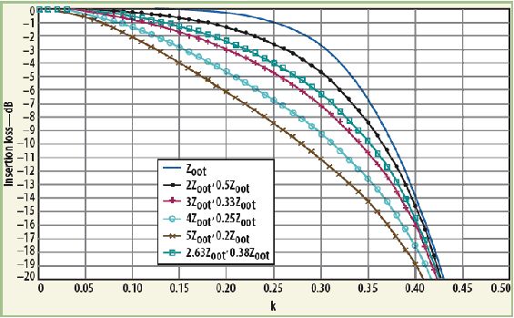 圖4中,對于優化和非優化的特性阻抗值,都把插損看作k的函數。相比采用了優化特性阻抗的情況,特性阻抗非優化時,插損增加,帶寬減小。于是,使用絞合傳輸線很容易獲得最佳特性阻抗值。