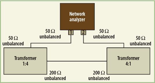 測量在Advantest的一個商用VNA,300kHz至3.8GHz模型R3765CG上進行。這個分析儀配有50Ω端接阻抗的非平衡測試端口。由于寬帶unun阻抗變壓器具有非平衡終端,轉換比率為1:4,為了讓該器件與測試設備相匹配,需要另一個轉換比率為4:1的器件來執行阻抗轉換。圖6和圖7顯示了所有的終端連接。測試終端和所有用于VNA的線纜都經過校準,以最大限度地減少它們出現錯誤的可能性。插損和通帶響應利用表示為對數幅值形式的傳輸系數S21來分析。