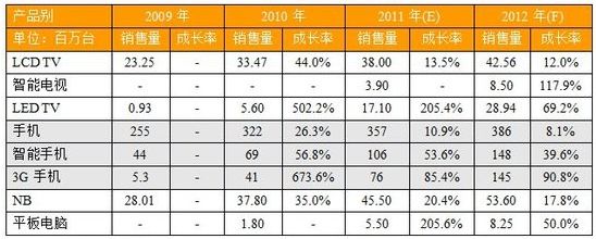 中國大陸LCD TV、手機和NB三大指針性消費電子產品,拓墣預估2012年銷售量雖然分別成長12%、8.1%和17.8%,但卻較2011年的13.5%、10.9%、20.4%成長率遜色,更難與2010年的高成長相提并論。顯示中國大陸內需市場已漸趨飽和,超高成長率很難再現。不過,中國大陸政府加速推展三網融合的策略,卻使得智能電視、智能手機、3G手機和平板電腦等利基產品,表現相對亮眼。