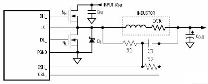 由于輸出電壓低,那么電流比較器的兩個輸入管腳的共模電壓較低,因此可以使用低輸入共模電壓的差動放大器,提高電流檢測的精度,降低噪聲。這種配置另一個大的優點是可以使用電感的DCR作為電流檢測電阻。要注意的是,在電感值和飽和電流滿足整個輸入電壓范圍和輸出負載電流范圍的前提下,對電感的DCR有一定的限制,因而在一些應用中需要定制電感。此外,電流比較器的輸入阻抗要大,兩個輸入管腳的偏置電流要小,從而提高使用DCR作為電流檢測電阻時的檢測精度。相關的濾波元件也在設計作相應的匹配,如下圖所示。