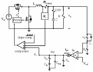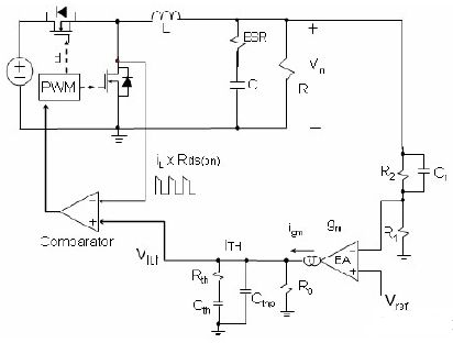 前面的討論知道:在每個開關周期,續流回路即低端的開關管流過的電流波形為下降階段的梯形狀波形。對于這種電流模式常稱為谷點電流模式。和峰值電流模式一樣,谷點電流模式反饋也有二個環路:一個電壓外環,另一個是電流的內環。其工作原理如下:高端的主開關管開通,電感激磁,電流線性上升;高端 MOSFET的導通一段固定的時間,此時間由 PWM 設定。當高端 MOSFET 關斷后,低端MOSFET 導通,此時電感開始去磁,電流線性下降。注意到低端 MOSFET 的電流隨著時間線性下降,電流檢測電阻的電壓信號也線性下降,由于此時電壓外環的輸出電壓信號低于電流檢測電阻的電壓,電流比較器輸出為低電平。當電流檢測電阻的電壓信號繼續下降,直到等于電壓外環的輸出電壓信號時,電流比較器的輸出翻轉,從低高電平翻轉為高電壓,邏輯控制電路工作,關斷低端的續流開關管的驅動信號,高端的主開關管開通,此時電感開始激磁,電流線性上升,進入下一個周期,如此反復。