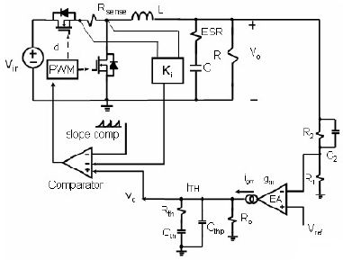 電流取樣電阻在輸入端的 Buck 變換器如圖 1 所示。在電流模式的 Buck 變換器拓樸結構中,反饋有二個環路:一個電壓外環,另一個是電流的內環。電壓外環包括電壓誤差放大器,反饋電阻分壓器和反饋補償環節。電壓誤差放大器的同相端接到一個參考電壓 Vref,反饋電阻分壓器連接到電壓誤差放大器反相端VFB,反饋環節連接到 VFB 和電壓誤差放大器的輸出端 VC。若電壓型放大器是跨導型放大器,則反饋環節連接到電壓誤差放大器的輸出端 VITH 和地。目前,在高頻 DCDC 的應用中,跨導型放大器應用更多。本文就以跨導型放大器進行討論。輸出電壓微小的變化反映到 VFB 管腳, VFB 管腳電壓與參考電壓的差值被跨導型放大器放大,然后輸出,輸出值為 VITH,跨導型放大器輸出連接到電流比較器的同相端,電流比較器的反相端輸入信號為電流檢測電阻的電壓信號VSENSE。由此可見,對于電流比較器,電壓外環的輸出信號作為電流內環的給定信號。對于峰值電流模式,工作原理如下:在時鐘同步信號到來時,高端的主開關管開通,電感激磁,電流線性上升,電流檢測電阻的電壓信號也線性上升,由于此時電壓外環的輸出電壓信號高于電流檢測電阻的電壓,電流比較器輸出為高電壓;當電流檢測電阻的電壓信號繼續上升,直到等于電壓外環的輸出電壓信號時,電流比較器的輸出翻轉,從高電平翻轉為低電壓,邏輯控制電路工作,關斷高端的主開關管的驅動信號,高端的主開關管關斷,此時電感開始去磁,電流線性下降,到一個開關周期開始的時鐘同步信號到來,如此反復。由此可見:峰值電流模式檢測的是上升階段的電流信號。在每個開關周期,輸入回路高端的主開關管流過的電流波形為上升階段的梯形狀波形。續流回路低端的開關管流過的電流波形為下降階段的梯形狀波形。而輸出回路電感的電流波形為包含上升和下降階段的鋸齒狀波形。因此:如果電流取樣電阻放在 Buck 變換器的輸入回路,系統一定工作于峰值電流模式。