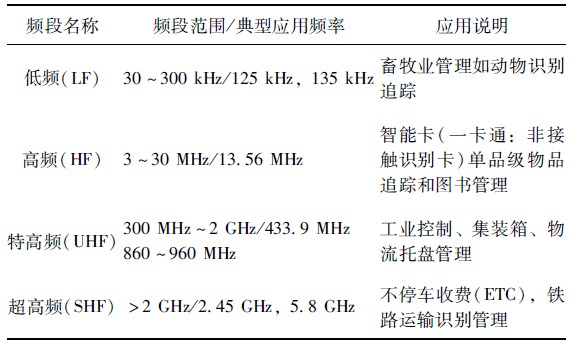 表1 RFID 標簽的工作頻率及典型應用。