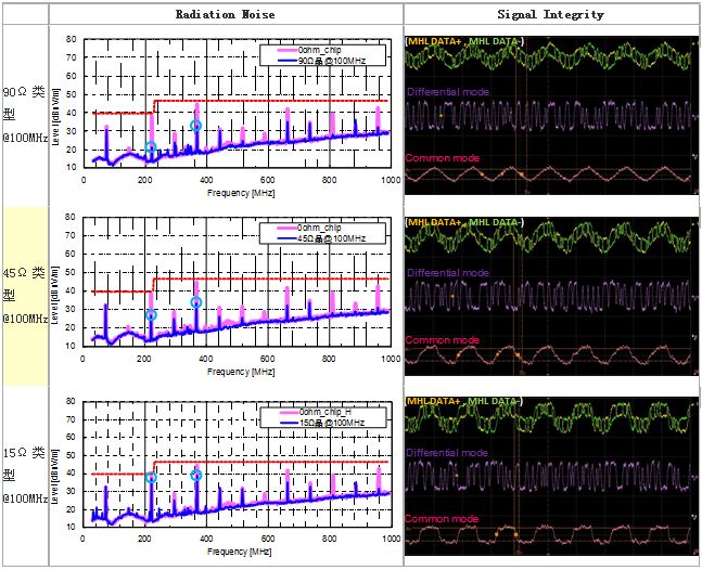 圖5顯示的MHL信號線使用各種共模扼流線圈時的輻射噪聲/信號波形評測結(jié)果。共模扼流線圈在產(chǎn)生噪聲的30MHz~1GHz頻率段內(nèi),按照阻抗由高到低的順序,分別使用以下3種類型(90Ω、45Ω、15Ω@100MHz) (靜態(tài)特性請參考圖6) 來進(jìn)行測量。