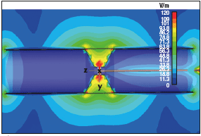雙錐型天線被設計用來在大頻率范圍內有效地工作。這種天線產生線性極化信號同時表現出極低的方位角波動,這意味著其多方向特征優秀。這種結構的有效帶寬處于兩倍頻程間,取決于可以容忍的輸入反射損耗。輸入反射損耗的影響受此結構小型化程度決定,小型化的原因是選擇了圓錐到圓柱的傳輸區間,或完全使用圓錐區間。圖8和圖9分別給出了某雙錐天線及其電磁仿真結果。圖10給出了其測試性能,可以清晰地看到其方向角圖樣波動非常小。雖然在商業通信系統中,這些構造的高功率處理能力并不總是很重要,但小巧的尺寸卻使其充滿吸引力。例如一種能覆蓋整個從800MHz到2.2GHz頻段的產品可以封裝在一個直徑32mm,長225mm的結構中。雖然可以獲得更寬的帶寬,但必須在帶寬和直徑上折中選擇。較大的直徑會展寬天線工作頻率。這些天線構造在非常寬的頻率范圍內保持了其輻射圖樣特性,使它們適合微小區和微微小區的應用。這樣的小區中使用天線放大信號(例如火車站)。擁有這種輻射圖樣的天線對于星形天線配置最有效。