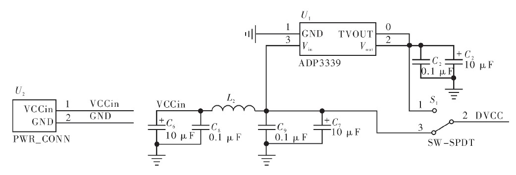 傳感器節(jié)點(diǎn)體積微小,通常攜帶能量有限的電池。能量供應(yīng)模塊在無(wú)線傳感器節(jié)點(diǎn)中至關(guān)重要,為傳感器節(jié)點(diǎn)各部分提供能量。需要長(zhǎng)時(shí)間數(shù)據(jù)采集的傳感器有的需要太陽(yáng)能等方式來維持節(jié)點(diǎn)的正常運(yùn)轉(zhuǎn)。節(jié)點(diǎn)的各部分也需要精心設(shè)計(jì)。節(jié)點(diǎn)微處理器的工作電壓為1.8~3.6 V,無(wú)線射頻芯片工作電壓為2.1~3.6 V,Flash供電電壓為2.7~3.6 V,USB轉(zhuǎn)換芯片由USB供電。因此電源可以選用3 V紐扣電池供電,有效減少了節(jié)點(diǎn)的大小。另外USB也可以作為供電源,同時(shí)作為編程電源,電源單元如圖2所示。LC濾波單元對(duì)交流電具有較好的濾波效果,同時(shí)又不會(huì)降低直流輸出電壓。低壓差的穩(wěn)壓器ADP3339保證了電源較好的穩(wěn)壓性。