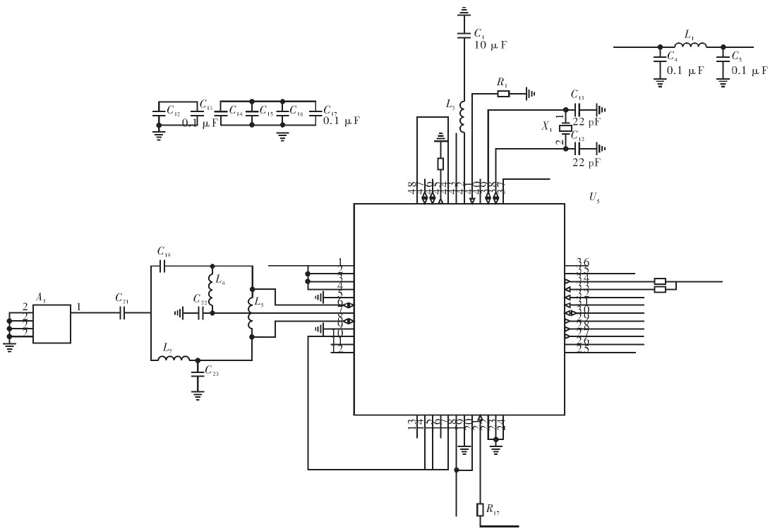 圖3中無(wú)線射頻模塊的外圍電路采用CC2420手冊(cè)提供的典型應(yīng)用電路的器件數(shù)值,這樣保證了芯片能工作在正常狀態(tài)。另外為達(dá)到最優(yōu)性能,必須使用電源去耦,去耦電容和電源過濾的設(shè)置和大小對(duì)于在應(yīng)用中獲得最優(yōu)性能起著關(guān)鍵作用,TI提供一個(gè)緊湊的參考設(shè)計(jì),必須嚴(yán)格按照該設(shè)計(jì)進(jìn)行。同時(shí)增加數(shù)字、模擬電源采用電容濾波。CC2420需要一個(gè)16 MHz的參考時(shí)鐘用于傳輸速率為250 kbit·s-1的數(shù)據(jù)收發(fā),參考時(shí)鐘可以來自外部時(shí)鐘源,也可以由內(nèi)部晶體振蕩器產(chǎn)生,這里采用內(nèi)部晶體振蕩器產(chǎn)生的方式。天線阻抗匹配至關(guān)重要,為獲得較好的發(fā)射功率,在原有基礎(chǔ)上對(duì)部分電容、電感進(jìn)行了適當(dāng)?shù)恼{(diào)整。CC2420與微控制器的通信通過4線SPI總線實(shí)現(xiàn)(SI、SO、SCLK、CSn),通過控制FIFO和FIFOP管腳接口狀態(tài)可以使芯片工作在發(fā)射或接收模式,另外CCA用于空閑信道評(píng)估,SFD用于控制時(shí)鐘或定時(shí)信息的輸入。