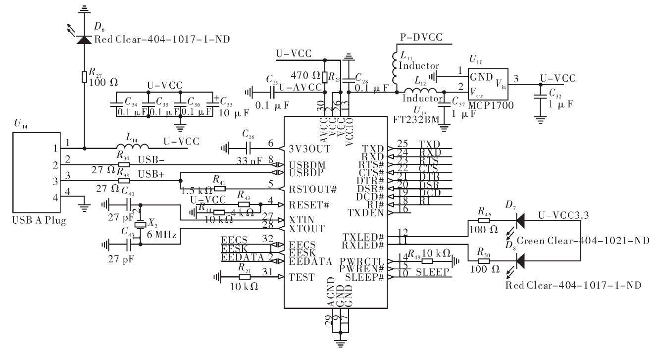 無(wú)線傳感器網(wǎng)絡(luò)由大量節(jié)點(diǎn)組成,這些節(jié)點(diǎn)按一定協(xié)議將采集的數(shù)據(jù)進(jìn)行融合、傳輸,最終將數(shù)據(jù)傳送到個(gè)人電腦上進(jìn)行處理和觀察,同時(shí)節(jié)點(diǎn)工作需要將特定的程序?qū)懭隖lash中。目前個(gè)人電腦最常用的接口為USB,而微處理器使用USART接口,為實(shí)現(xiàn)兩種接口之間轉(zhuǎn)換,節(jié)點(diǎn)使用FT232BM芯片作為轉(zhuǎn)換芯片。FT232BM是一種單片USB到異步串口轉(zhuǎn)換芯片,支持全握手和調(diào)制解調(diào)接口信號(hào),在TTL級(jí)數(shù)據(jù)傳輸速度范圍為300 bit·s-1~3 Mbit·s-1.芯片通過USB總線供電,工作電壓為4.35~5.25 V,采用外部6 MHz時(shí)鐘。USB PID、序列號(hào)和產(chǎn)品信息可以保存在外部EEPROM中。USB通信模塊接口如圖5所示。