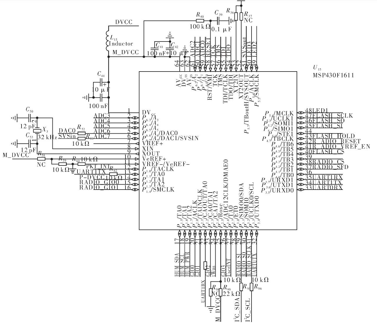 微處理器是無(wú)線傳感器節(jié)點(diǎn)的核心,傳感器數(shù)據(jù)的數(shù)據(jù)處理,串行口以及無(wú)線模塊的傳輸與控制均需要微處理器的參與。節(jié)點(diǎn)微處理器TI公司的16為超低功耗MSP430F1611.該微處理器工作電壓為1.8~3.6 V,在RAM數(shù)據(jù)保持方式下耗電僅為0.2μA,在激活工作1 MHz的情況下為330μA,可以工作在5中低功耗模式,喚醒時(shí)間<6μm.Flash大小為48 kB,RAM大小為10 kB.芯片內(nèi)部有16位定時(shí)器Timer_A和Timer_B具有捕獲/比較功能;大量的捕獲/比較寄存器可用于事件計(jì)數(shù)、時(shí)序發(fā)生等;多功能串口(USART)可以實(shí)現(xiàn)異步、同步和I2C串行通信,可以方便地實(shí)現(xiàn)多級(jí)通信的應(yīng)用;具有較多的I/O端口,最多達(dá)6×8條I/O口線,P1、P2口還可以接收外部上升或下降沿的中斷輸入;12位A/D轉(zhuǎn)換器有較高的轉(zhuǎn)換速率,最高可達(dá)200 kbit·s-1,能滿足大多數(shù)數(shù)據(jù)采集的應(yīng)用。微處理器模塊如圖6所示。溫度濕度傳感器連接P1口5、6、7管腳,無(wú)線模塊SPI接在P3口1、2、3和P4.4管腳,USB通信模塊數(shù)據(jù)線連接到P3口6、7管腳。其他管腳分別用于控制和擴(kuò)展接口。外部晶振大小為32MHz。