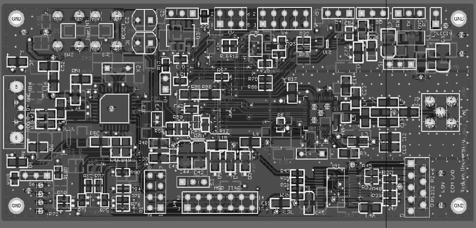 電路板根據(jù)不同的標(biāo)準(zhǔn)有不同的分類,在設(shè)計(jì)中大多數(shù)根據(jù)板的數(shù)目分類,在電氣連接關(guān)系復(fù)雜的電路板設(shè)計(jì)中,雙面板難以滿足電路布線的要求,這時(shí)就必須考慮使用多層板。本節(jié)點(diǎn)采用4層板,頂層主要是USB模塊和無(wú)線模塊,底層為微處理器模塊,內(nèi)部層為電源層和地層。設(shè)計(jì)結(jié)果如圖7所示。