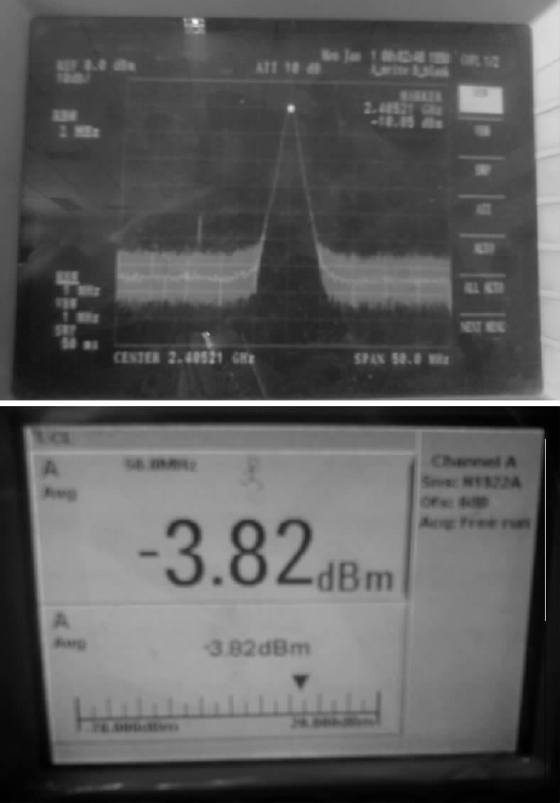 為對(duì)設(shè)計(jì)的節(jié)點(diǎn)功能進(jìn)行驗(yàn)證,首先使用IAR集成開發(fā)環(huán)境編寫CC2420的測(cè)試程序,通過JTAG將程序燒入Flash,經(jīng)過檢測(cè),射頻部分較好地滿足了預(yù)期。芯片工作頻帶范圍為2.4~2.48 GHz,發(fā)射功率為0 dBm.經(jīng)過頻譜儀和頻率計(jì)驗(yàn)證設(shè)計(jì)符合要求,驗(yàn)證結(jié)果如圖9所示。