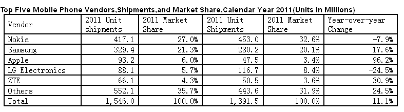 據(jù)IDC 發(fā)布的2011 年第四季度全球手機(jī)市場(chǎng)數(shù)據(jù)顯示:蘋果成為全球第三大手機(jī)廠商(不是智能手機(jī)領(lǐng)域)。同步匯總的2011 年全年手機(jī)市場(chǎng)數(shù)據(jù)中.蘋果同樣強(qiáng)勢(shì)上升,以9320 萬臺(tái)iPhone 銷量佳績(jī)穩(wěn)坐“全球第三大手機(jī)廠商”寶座,其中中國(guó)廠商中興以6610 萬臺(tái)手機(jī)銷量成為全球第五大手機(jī)制造商(華為非上市公司無須公布財(cái)報(bào))。