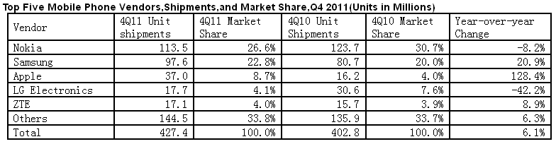 2011 年第四季度,全球共賣出4.274 億部手機(jī).同比去年( 4.028 億部)上升6.1 % ,這一漲勢(shì)高于IDC此前預(yù)測(cè)的4.4 % 漲幅,但低于2011 年第三季度9.3%的增幅。其中功能機(jī)的市場(chǎng)份額比預(yù)期的衰減速度更快,市場(chǎng)增幅為兩年來最低。