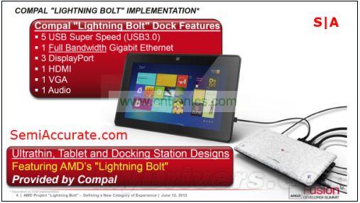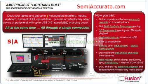 Lightning Bolt由三部分組成,分別是線纜、特殊的底座及筆記本之類的終端,聽起來很復(fù)雜,但其實Lightning Bolt使用的也是標準的DP接口,理論上甚至能支持雷電接口。雖然只有一條DP通道,但是用它就可以連接Eyefinity多屏輸出以及5個USB 3.0接口,這也是Lightning Bolt接口在平板及超級本這樣缺少空間提供又大量接口的設(shè)備上存在的意義。