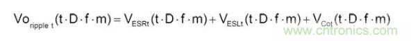 一般而言,在穩態(Steady State)及負載固定時,輸出電容的紋波電壓主要是由電感的紋波電流造成,可先計算出電感的紋波電流,再利用歐姆定律,電感微分公式及電容電荷儲存公式,分別計算出ESR、ESL及Capacitance的紋波電壓。再將此三種紋波加總起來,便可得輸出電容的紋波電壓,如公式1所示: