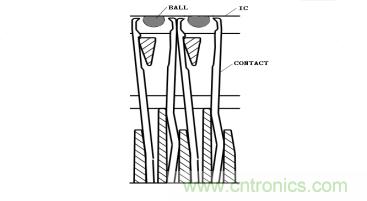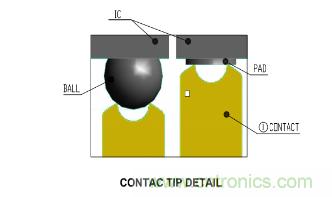 頂針式的適配座如圖5所示,黃色部分是頂針,黑色部分分別是焊球管腳IC和焊盤式管腳IC,不管是焊球還是焊盤式IC,其帶有彈簧能上下活動(dòng)的頂針都能良好接觸。