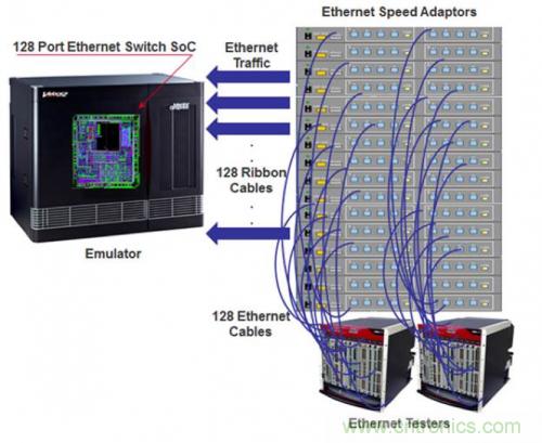 今天,以太網(wǎng)交換機和路由器已達到 256 個端口(到年底將會增加到 1024 個端口),而且它們可處理高達 120 Gb/s 的流量。同時,網(wǎng)絡交換的延遲也在持續(xù)下降中,最低延遲已降至 1 µs。所有這些因素促使如今的網(wǎng)絡交換機和路由器芯片成為有史以來最大規(guī)模的芯片,達到了五億門級。在流片完成之前驗證此類復雜 IC 設計是一項難以完成的任務。我們來考慮下具有 128 端口以太網(wǎng)接口的 SoC 設計。