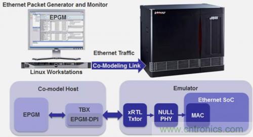 在此場景中,以太網(wǎng)測試儀模型運行于連接到硬件仿真器的Linux工作站上。基于成熟的實現(xiàn) IP,模型準確再現(xiàn)了實際的物理測試儀。這種虛擬測試儀包括以太網(wǎng)數(shù)據(jù)包生成器和監(jiān)視器 (EPGM),可以為 1G、10G、40G/100G 和 120G 網(wǎng)絡分別配置 GMII、XGMII、XLGMII/CGMII 和 CXGMII 接口。每個支持的MII端口都需要一個 xRTL 事務處理器(圖 2)。