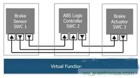 將設計與硬件決策分開使車輛生產商/OEM能夠依據(jù)所需的車輛功能進行自上而下的設計。存在于這個設計時間的虛擬功能總線(VFB)概念讓所有軟件電子控制單元都能夠實現(xiàn)互連和獲得測試。這讓設計人員可專注于應用層,而不是根本的軟件基礎建設。通過采用虛擬功能總線,應用軟件組件(SWC)與其它應用軟件組件也相互獨立。軟件組件向虛擬功能總線發(fā)出輸出信號,虛擬功能總線再將信息傳送給目標組件的輸入埠。AUTOSAR定義了輸入和輸出端口,以及交換信息的格式。這種抽離式的(abstracted)方法使得在定義相關硬件之前可實現(xiàn)所有車輛軟件功能和接口交互驗證。設計調整也因此變得容易得多,同時所有功能都被定義成虛擬功能總線上的軟件組件(圖2)。