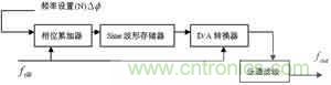 基本模型如圖1所示,主要由時鐘頻率源fclk、相位累加器、波形存儲器(ROM)、數/模轉換器(D/A)、以及低通濾波器(LPF)組成。輸出信號波形的頻率表達式為: