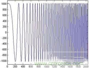 根據上面的程序,取調頻斜率為400,頻率控制字為10,幅度量化為10位(和所使用的D/A配合),相位累加器為24位,用Matlab仿真得到的線性調頻信號的波形和相應的幅頻響應如圖3和圖4所示。