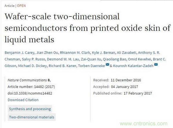 描述了這一新技術的論文“Wafer Scale Two Dimensional Semiconductors from Printed Oxide Skin of Liquid Metals”已經在 Nature Communications 雜志上發表。