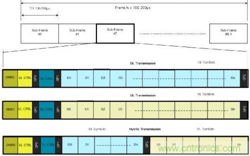 將端到端時(shí)延減小到 1ms 以內(nèi)是 5G 的另一個(gè)重要目標(biāo),旨在滿足任務(wù)關(guān)鍵型應(yīng)用的超高可靠低時(shí)延用例,以及擴(kuò)展的移動(dòng)寬帶用例(諸如承諾為服務(wù)提供商帶來(lái)更高收入的游戲)的要求。5G 正在改進(jìn)幀結(jié)構(gòu)以實(shí)現(xiàn)上述這一目標(biāo)。圖 1 給出一種準(zhǔn) 5G 標(biāo)準(zhǔn)幀結(jié)構(gòu)方案。該方案具有 100-200 微秒級(jí)的很短的傳輸時(shí)間間隔(TTI),比 4G LTE 的 TTI(1ms)縮短 10 倍,具備快速的 Hybrid ARQ(自動(dòng)重發(fā)請(qǐng)求)確認(rèn),可縮短系統(tǒng)時(shí)延。利用前載解調(diào)制參考和控制信號(hào),可在接收幀的期間執(zhí)行幀處理,而不是等緩沖整個(gè)子幀之后再處理。幀結(jié)構(gòu)還用來(lái)簡(jiǎn)化和加速每子幀的快速調(diào)度請(qǐng)求。因此,5G 基帶所需的計(jì)算與 4G LTE 系統(tǒng)相比會(huì)顯著增加。