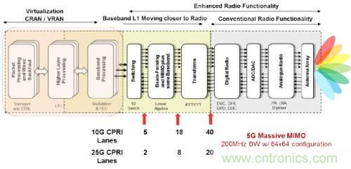 射頻單元之間的連接要求急劇增加。為了比較經(jīng)濟(jì)地實(shí)現(xiàn)這些系統(tǒng),有必要在無(wú)線電中集成 L1 基帶信號(hào)處理或其中的一部分。未來(lái)的這種功能劃分可能導(dǎo)致網(wǎng)絡(luò)節(jié)點(diǎn)中 L1-L2 與無(wú)線電功能處在相同位置。圖 3 介紹了 64 個(gè)天線單元的 Massive MIMO 在不同系統(tǒng)功能邊界上的連接要求,凸顯了 L1 與無(wú)線電共址的必要性。