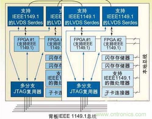 如果驅動器/接收器對允許進行JTAG可接入的全速BIST(內建自測),也能測試板卡之間的背板互連,或者可以驗證板卡之間的高速 LVDS串行鏈接,那么就能對板卡間背板互連的完整性進行測試,或者驗證板卡間的高速LVDS串行連接。或這些高速互連都是電容性耦合,并且驅動器/接收 器支持,則可以進行IEEE 1149.6測試。