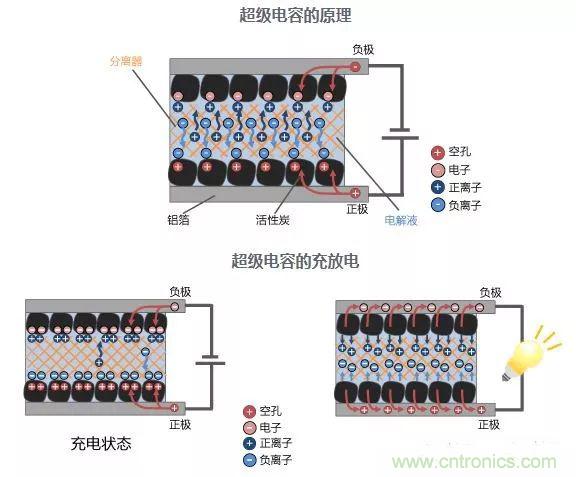 超級電容也是同樣的基本原理,與普通電容不同的是,電極間是用電解液而不是介電質填充。施加電壓的話,電極和電解液的面呈現正負電荷排列,形成稱為「電氣雙層」的層,在此出存儲電荷。超級電容的靜電容量與電氣雙層的面積成正比,為了盡可能地使該面積變大,在電極上使用活性炭。活性炭的表面有許多開放的孔,這是為了實際獲得最大的表面積。