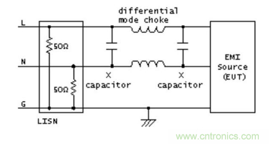電容的作用是將高頻干擾電壓“短路”,另外,當干擾信號頻率很高時,抑制線圈將產(chǎn)生很大的交流阻抗。圖2顯示了兩種濾波類型的結(jié)構(gòu),其中,LISN是用于測量目的的線性阻抗穩(wěn)定網(wǎng)絡(luò)。如果是共模問題引起的干擾,X類型電容基本上沒有作用,因為兩線上的干擾電壓是一樣的。因此,了解干擾類型對于選擇合理的電路結(jié)構(gòu)將起重要作用,并為解決問題提供技術(shù)依據(jù)。