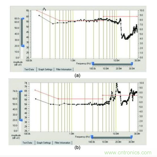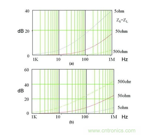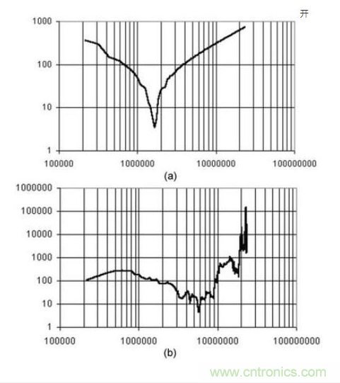 上面的例子說明,選擇一個具有很高插損的濾波器也不能很好抑制傳導噪聲的原因是,電源輸入端阻抗的影響。因此,設(shè)計者除了選擇一個合適的濾波器之外,還需要了解電源的阻抗特性、共模阻抗和差模阻抗。阻抗測試可以借助專用的阻抗測試儀或者傳導分析儀。一種濾波器的共模阻抗(a)和差模阻抗(b)的變化如圖5所示。