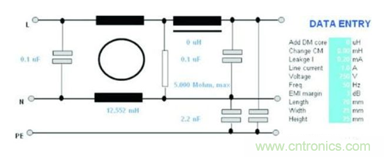 知道設(shè)備的干擾特性和輸入阻抗特性后,設(shè)計或者選擇一個濾波器就變得簡單了。如果使用一個現(xiàn)成的濾波器,可以調(diào)用過去積累的濾波器數(shù)據(jù)庫,比對濾波器參數(shù),找到一個合適的濾波器。如果沒有合適的或者想專門設(shè)計一個專用濾波器,可以借助專用的濾波器設(shè)計軟件。在確定一個濾波器模式后輸入濾波器一些簡單的約束條件,設(shè)計軟件根據(jù)阻抗特性自動計算出最合適的組件值,以及提供最合適的衰減。(如圖6所示)