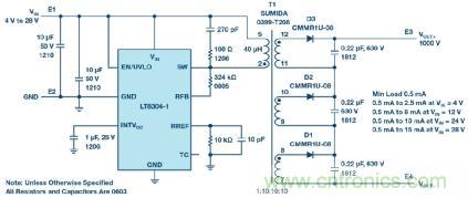 LT8304-1 反激式轉換器設計采用的組件較少。圖 1 顯示一款完整的 4 V~28 V 輸入至 1000 V 輸出解決方案,其能夠支持 15 mA 負載。輸出電流能力 隨著輸入電壓的增加而提高,當輸入電壓高于 24 V 時可達到 13mA。由于 LT8304-1 可通過原邊波形檢測輸出電壓,因此無需配置大尺寸高電壓分壓器,也不必采用光耦合器。