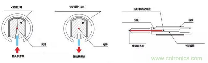 光纖快速連接器/冷接子可分為預置光纖和非預置光纖兩大類。預置光纖快速連接器/冷接子的接續點在連接器內部,并預置有匹配液;非預置光纖快速連接器/冷接子的接續點在連接器表面,不預置匹配液,直接通過適配器與目標光纖對接。非預置光纖快速連接器/冷接子的工作原理很簡單,這里不做贅述。下面詳細說明預置光纖快速連接器/冷接子的原理:如下圖所示,預置光纖膠接在插芯中,接續點設在放有折射率近似纖芯的導光材料-匹配液的V型槽中,從而實現預置光纖和目標光纖的無縫貼合。
