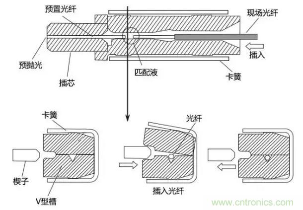 如下圖所示,光纖快速連接器/冷接子內部的插芯和端面都在出廠前經過了預研磨和預拋光,機械接續機制位于插芯的末端,用來固定插入的光纖。從下圖我們可以看出,機械接續機制主要由V型槽和夾持元件組成;當需要插入光纖時,用楔形夾打開V型槽,方便光纖順利插入,當光纖插入到V型槽并固定后,從V型槽中拔出楔形夾即可。