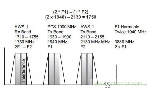 廣泛使用的900 MHz頻段的PIM示例假定兩個GSM載波,一個在935 MHz,另一個在960 MHz。在這種情況下,910 MHz三階產(chǎn)品位于基站接收頻段(圖4)。