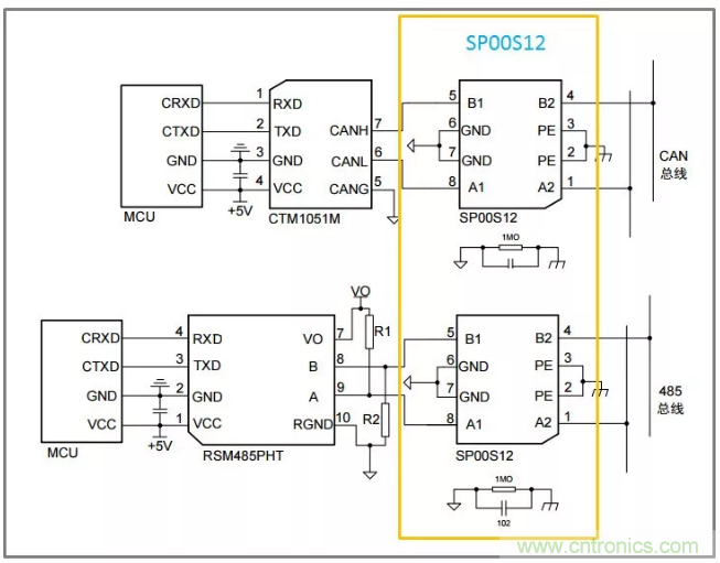 前面只是對ESD的作用機(jī)理進(jìn)行了分析,但隨著工業(yè)產(chǎn)品對通信接口的EMC等級要求越來越高。許多應(yīng)用要求滿足IEC61000-4-2靜電放電4級,IEC61000-4-5浪涌抗擾4級要求。一般的收發(fā)器ESD、浪涌的防護(hù)等級均比較低,如CTM1051M隔離CAN收發(fā)器的隔離耐壓為2500VDC,裸機(jī)情況下,ESD、浪涌等級均較低。所以有必要增加外圍電路,提高通信端口的EMC等級。