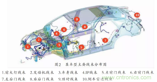 線束是汽車的神經網絡系統,在整車的運行中傳遞電壓、信號及大量的數據,圖1為各用電器線束連接示意圖。特別是在互聯網、大數據背景下,這就要求線束載體不僅僅起到通斷作用,對數據的傳輸速率及響應能力提出了更高的要求,同時由于線束的物理布置空間有限,對其失效性和售后返修帶來更大挑戰。