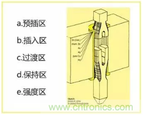 業(yè)界為 Press-fit 端子設(shè)計(jì)了各種形態(tài),這些形態(tài)各有優(yōu)缺點(diǎn)。其中,魚(yú)眼孔端子是應(yīng)用最為廣泛的 Press-fit 端子結(jié)構(gòu)。通常一個(gè)典型魚(yú)眼孔端子分 5 個(gè)區(qū)域(如上圖所示)。