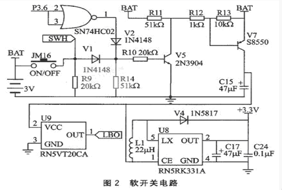 與圖1相比較,用JM16鍵開機(jī)后,還必須利用單片機(jī)P3.6 輸出低電平實(shí)現(xiàn)開機(jī)自保,因此稱該電路為“軟開關(guān)電路”。使用該軟開關(guān)電路的優(yōu)點(diǎn)是無須考慮按鍵去抖動問題,硬件電路簡單,可降低硬件成本,節(jié)約印制板板面,在手持式產(chǎn)品中印制板板面是非常寶貴的(元器件的數(shù)量直接影響印制板的大小和產(chǎn)品整體外觀)。缺點(diǎn)是當(dāng)受到外界強(qiáng)信號干擾或由于電池電量不足而引起死機(jī)時,按鍵JM16將不起作用,必須取出電池,再重新裝入方能解決死機(jī)現(xiàn)象。當(dāng)然這種情況出現(xiàn)的機(jī)率極低,且因電池電量不足而引起死機(jī)時,就需要更換電池了。而圖1的硬開關(guān)電路中,當(dāng)碰到死機(jī)現(xiàn)象時,無需觸摸電池,通過按鍵JM2就能實(shí)現(xiàn)開機(jī)和關(guān)機(jī)。