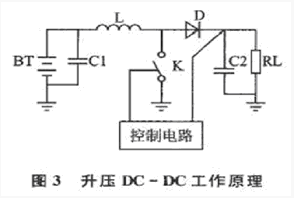 開關(guān)K導(dǎo)通時電池BT給電感L充電,在L中以場的形式儲存能量1/(2L×I2)。 其中,I為電感電流。K斷開后,L中的磁能又以電能的形式釋放給濾波電容C2和負(fù)載RL。周期性的開關(guān)操作使電池能量源源不斷地送入負(fù)載,而輸出電壓被轉(zhuǎn)換為: