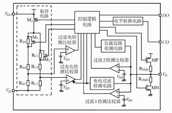 鋰離子電池保護電路為了實現其基本功能,首先需要檢測異常現象。過充電和過放電檢測是將電池電壓進行分壓(采樣)后與基準電壓比較實現的;而對于過流檢測,保護芯片首先將充放電過程中的電流轉化為在功率管FET1、FET2上的電壓,然后通過VM與基準電壓比較完成,放電過流檢測的是正電壓,充電過流檢測的是負電壓。
