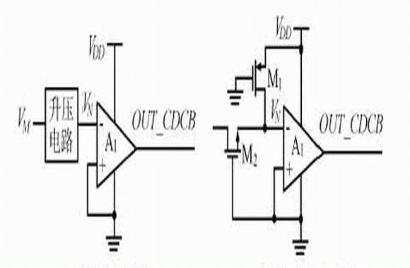 充電過流的檢測歸結為檢測VM電壓,其臨界值為VCH(約為-1.3V)。如果所用工藝的MOS管閾值電壓可以調節,負電壓檢測電路可用差分結構的比較器實現,其中比較器的一個輸入端接地,并且兩個差分對管的閾值電壓需要調整。為了使該電路能用常規的CMOS 工藝實現,本文在過零比較器的基礎上引入升壓電路,如圖6(a)所示當VM》VCHA時,升壓電路使VN>0 。升壓部分具體實現如圖6(b)所示。