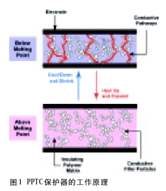 保護繼電器的一個常用元件是高分子聚合物正溫度系數(PPTC)自復過流保護器(見圖1)。 它是用碳黑這種導電性填料做成的。在這個元件中碳黑構成網狀導電通路。在正常的情況下,PPTC保護器呈現低電阻,但是,在PPTC保護器中流過的電流過大時,它的溫度升高,結晶狀聚合物變成非結晶狀態。這個轉變引起聚合物膨脹,使得導電性聚合物內的網狀導電通路斷開。這個變化引起它的電阻急劇上升。由于電阻增大,于是保護器中流過的電流便下降到很小。PPTC保護器保持這個狀態,直到故障被排除。一旦把故障排除了,保護器的溫度下降,碳黑形成的導電通路恢復,它又回到低電阻狀態。可以不使用PPTC 保護器而用傳統的熔斷器來保護繼電器。不過,在使用熔斷器的情況下,每當發生故障,就需要更換熔斷器。PPTC保護器的主要優點在于它具有自復功能,從而可以減少昂貴的服務費用和保修費用。