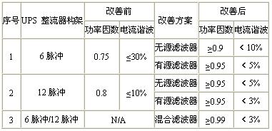 因此,在選擇UPS的同時(shí),必需考慮相應(yīng)的功率因數(shù)及諧波改善措施。目前的主流的UPS的改善主要包括移相、無源濾波器、有源濾波器、混合式濾波幾種方案。其中移相是指在6脈沖整流器基礎(chǔ)上,增加一個(gè)移相變壓器后再增加一個(gè)6脈沖整流器,可以抑制諧波。機(jī)種諧波改善情況如下表所示: