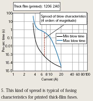 源于這種阻值變化,芯片保險(xiǎn)絲可能在正常浪涌電流條件下熔斷。或反過(guò)來(lái)說(shuō),它也可能在過(guò)載條件下需要熔斷時(shí)而沒(méi)能熔斷。當(dāng)然,這是工程師必須避免的最壞情況。圖5顯示了印刷厚膜保險(xiǎn)絲熔斷特性的典型擴(kuò)散。