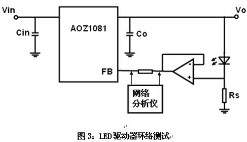 這樣,就必須引入一種隔離的電路,使注入的信號(hào)不影響電源系統(tǒng)的正常工作。通常,電壓跟隨器具有阻抗變化,也就是其輸入相當(dāng)于開路,輸出相當(dāng)于短路,同時(shí),時(shí)還具有緩沖的作用,也就是在信號(hào)源和負(fù)載之間緩沖,將輸入信號(hào)無損耗的輸出。因此,可以使用圖3的電路測(cè)量LED驅(qū)動(dòng)器的環(huán)路穩(wěn)定性。