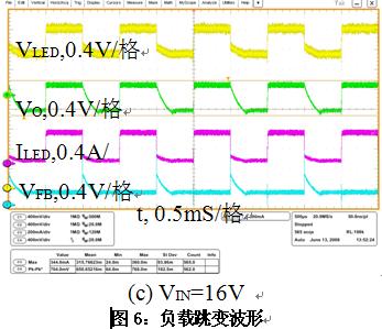 可以用圖5的負(fù)載跳變來驗(yàn)證系統(tǒng)的穩(wěn)定性,MOS驅(qū)動(dòng)信號(hào)的頻率為1kHz,負(fù)載電流從35mA到350mA跳變,波形如圖6所示